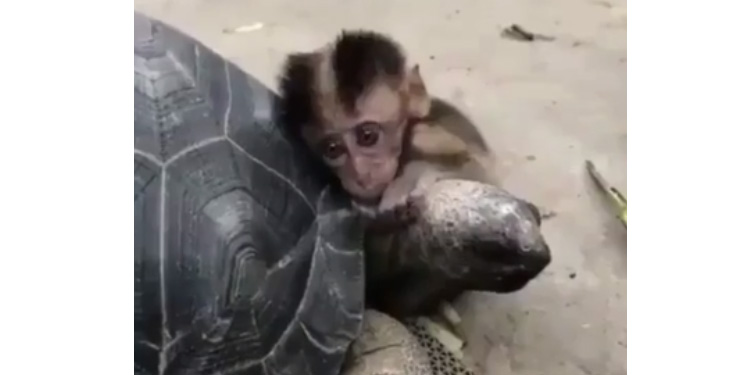 Baby Monkey Bonds With A Tortoise After Its Mom Dies