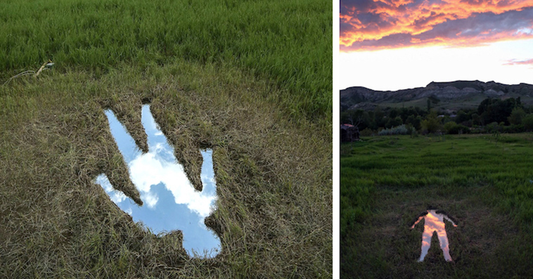 The Reflection Of Ever Changing Sky By Human-Shaped “Pool” Lieing In A Field