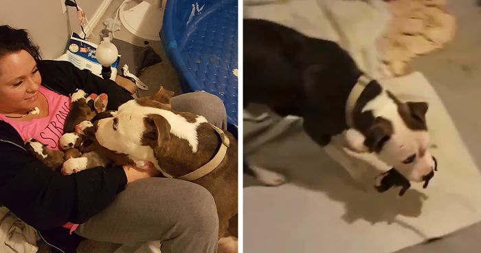 Woman Overwhelmed When Her Rescue Pit Bull Places Her 11 Newborn Puppies Into Her Lap