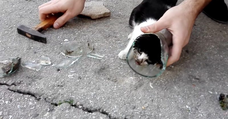 Men Rescue A Terrified Kitten With Its Head Stuck In A Glass Jar…Poor Thing