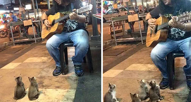 Adorable video shows busker performing to group of kittens